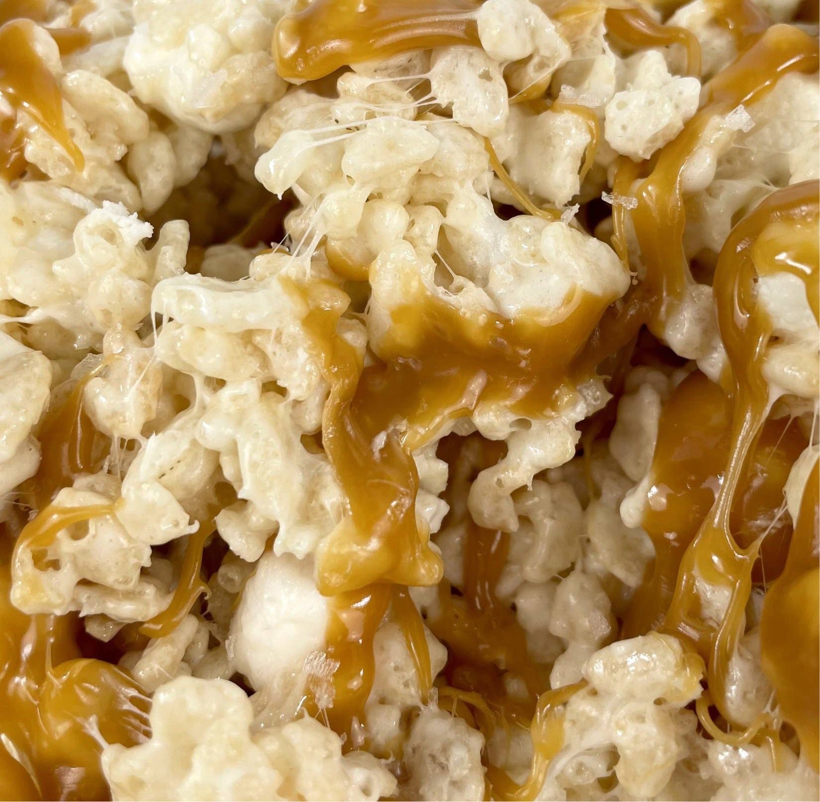 Salted Caramel Crispie Mix Clusters is our signature treat topped with caramel, mini marshmallows and sea salt.
