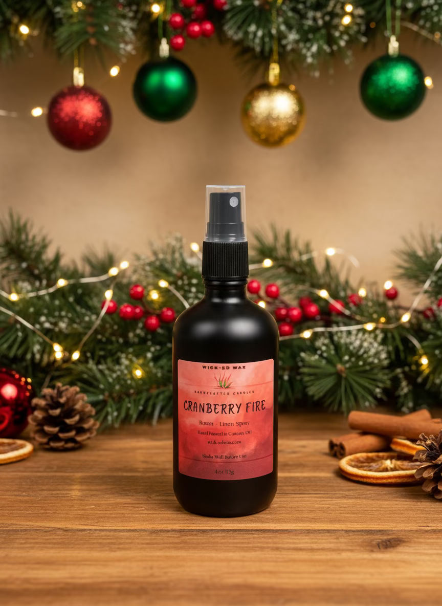 Ignite the warmth of the holiday season with our 4 oz Cranberry Fire Room and Linen Spray. This inviting blend captures the cozy glow of a fireside gathering with a vibrant top of cinnamon, orange, nutmeg, and cranberry for a spicy, tart burst; a heart of clove for bold warmth; and a rich base of tonka, vanilla, and amber for a smooth, comforting finish. Hand-crafted for creating a festive ambiance or gifting to loved ones, this spray is perfect for refreshing rooms or linens, infusing your space with the radiant warmth of the holiday season.