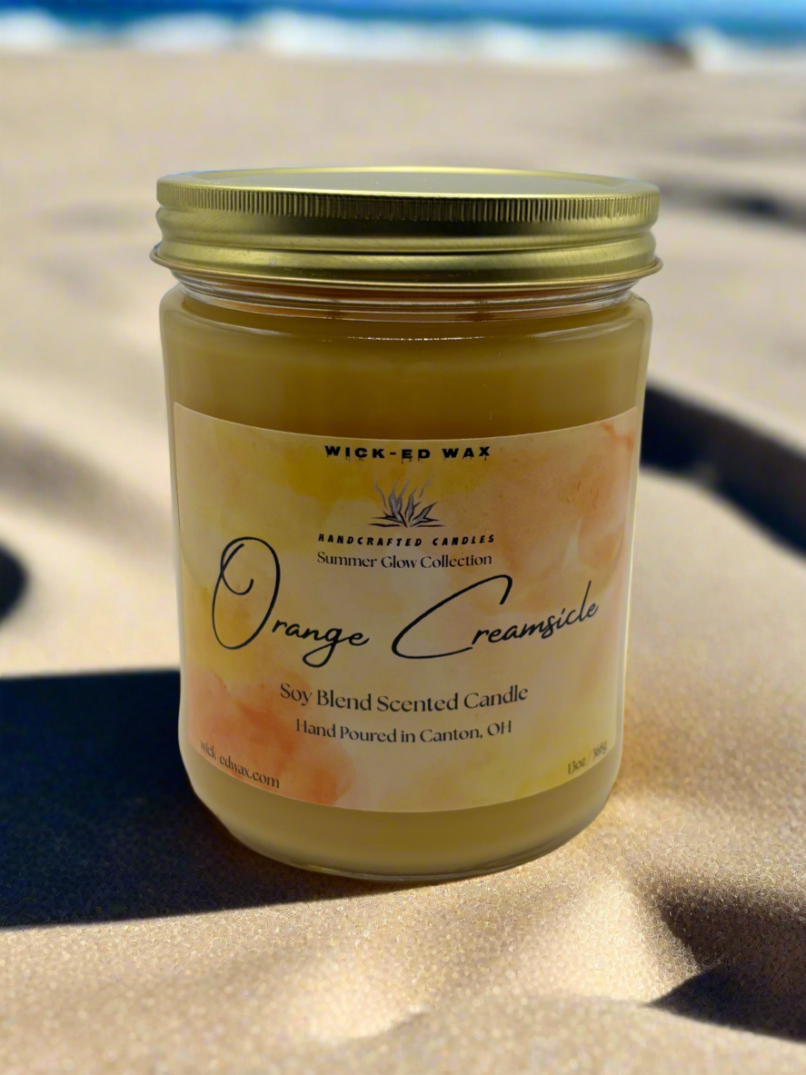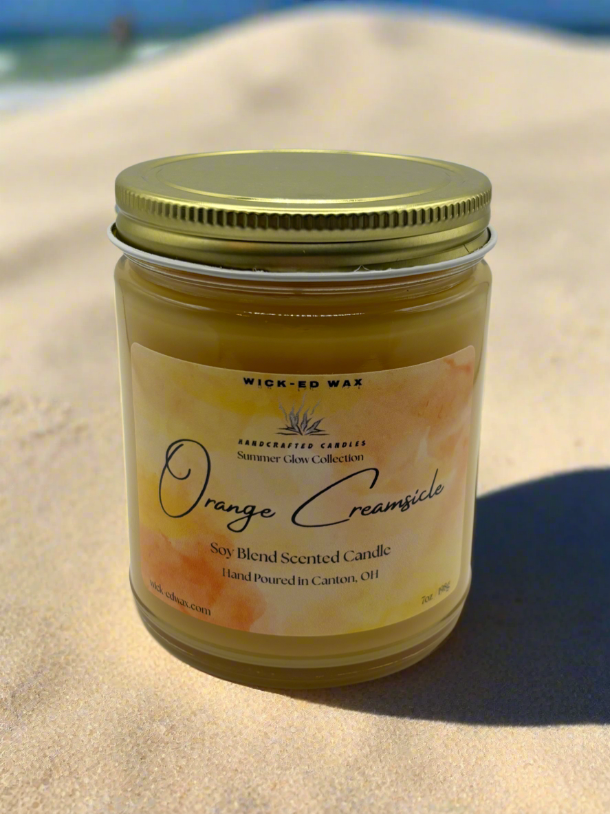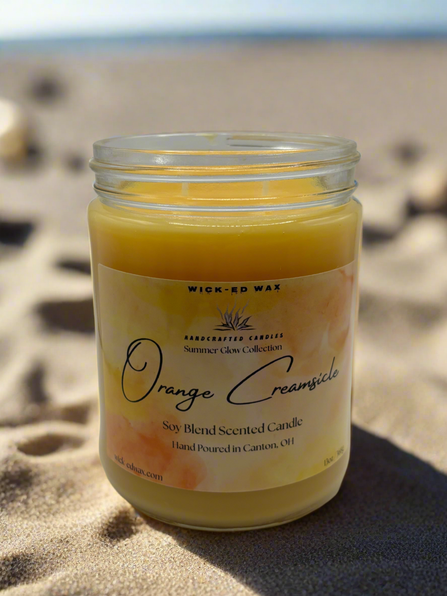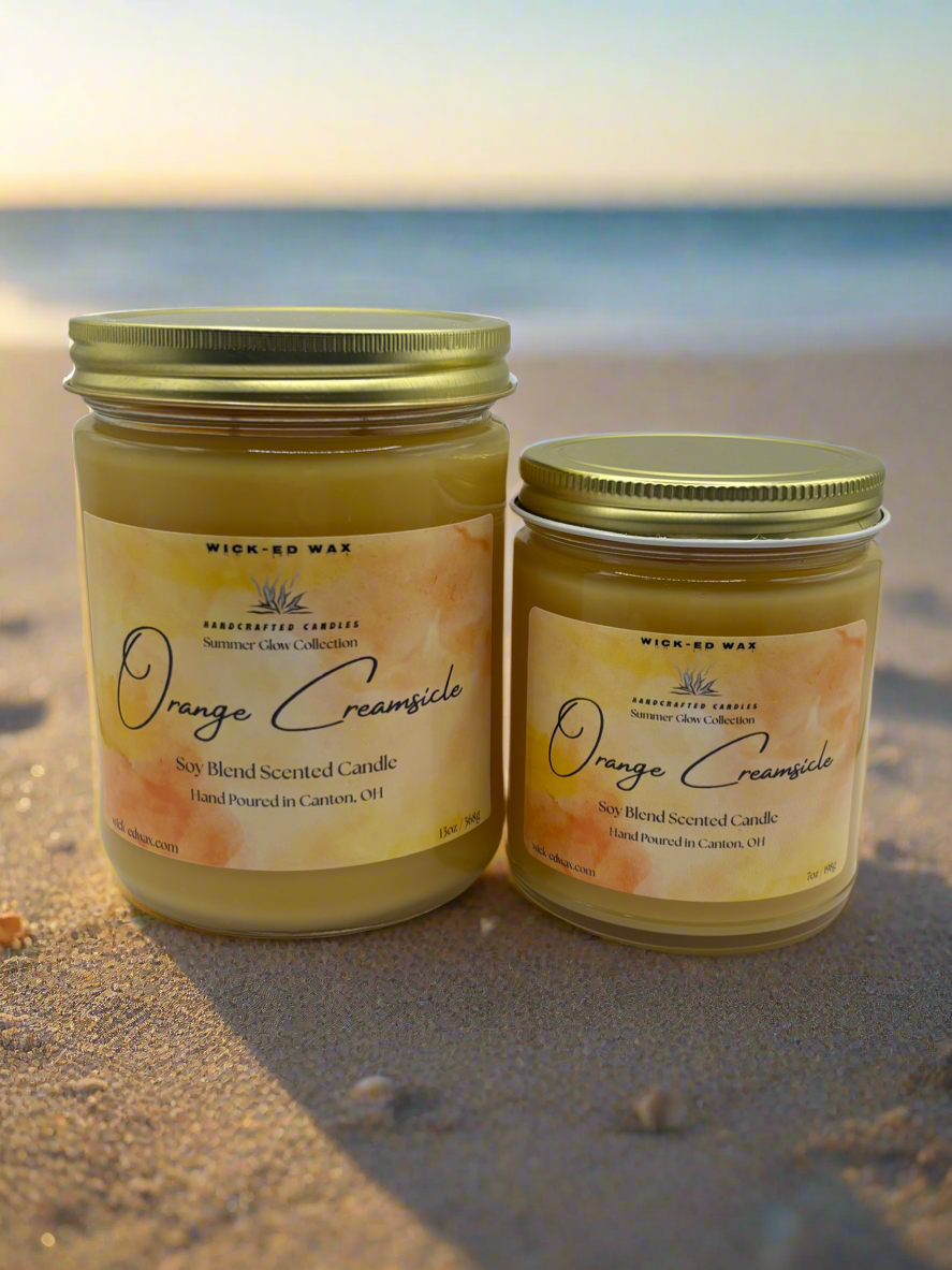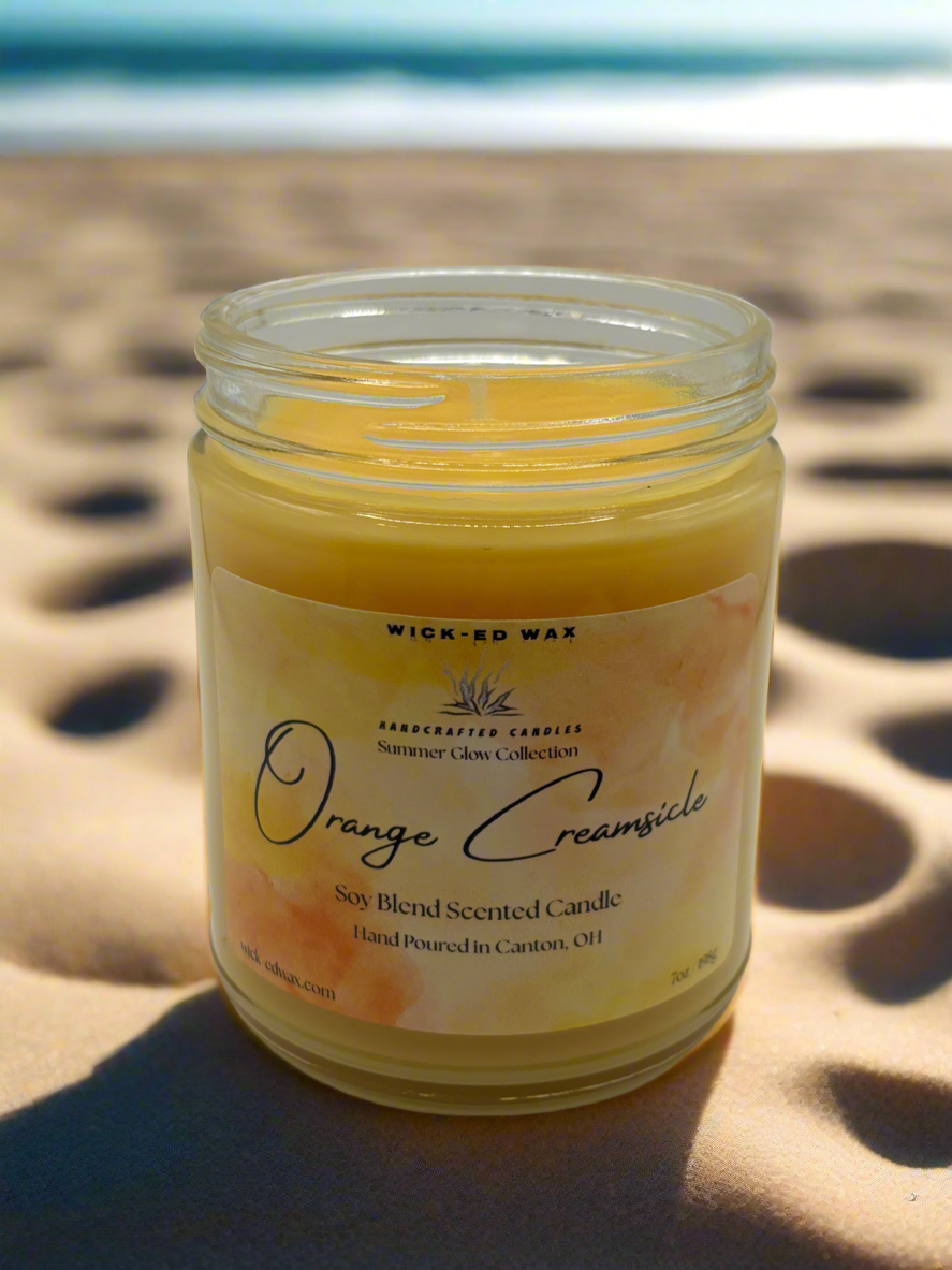 Bask in the warmth of summer with our Orange Creamsicle Candle from the Summer Glow Collection. Hand-poured with a premium soy blend wax, this candle combines the tangy zest of sun-ripened oranges with creamy vanilla sweetness, evoking the joy of a classic creamsicle treat. Its vibrant citrus and smooth notes create a cozy, sunlit ambiance that brightens any space. Available in two sizes: 7oz (approx. 40-hour burn time) and 13oz (approx. 50-60-hour burn time). Perfect for a radiant, summery vibe.